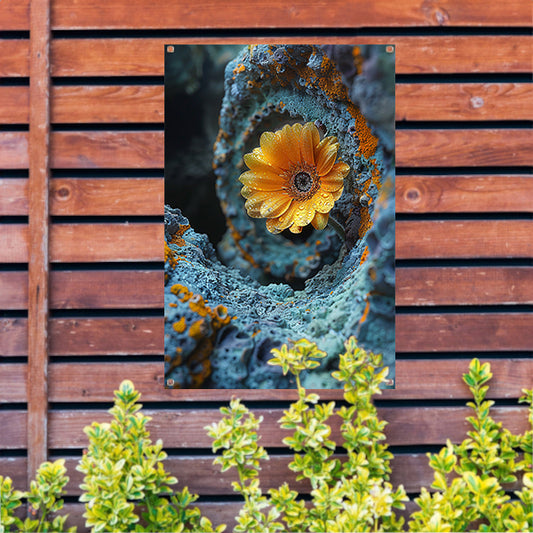 Gele bloem bloeit in buitenaardse rotsformatie tuinposter