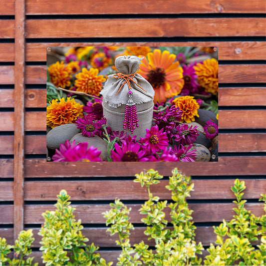 Paarse bloemen met tas tuinposter