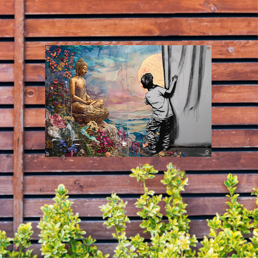 Jongen Ontdekt Spirituele Wereld achter Gordijn tuinposter