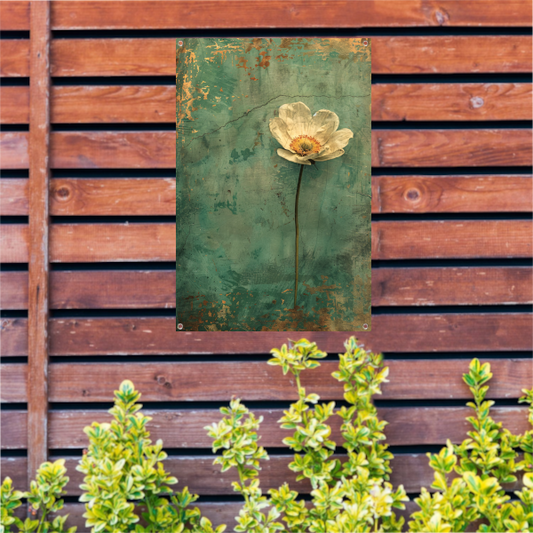 Delicate witte bloem op verweerde achtergrond tuinposter