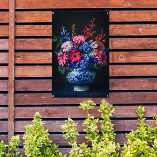 Levendige bloemen in elegante blauw-witte vaas tuinposter