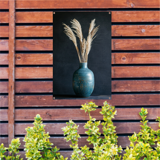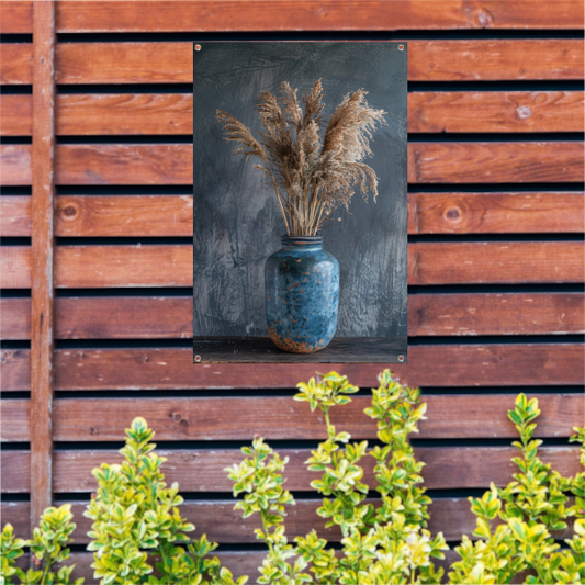Rustieke blauwe vaas met graanstengels tegen donkere achtergrond tuinposter