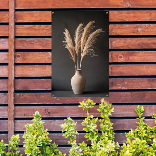 Stijlvolle vaas met beige pampasgras op donkere achtergrond tuinposter