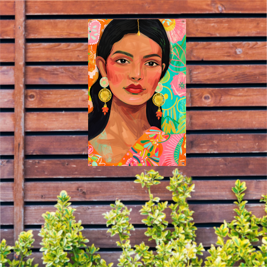 Kleurrijk portret Indiase vrouw met bloemenachtergrond tuinposter