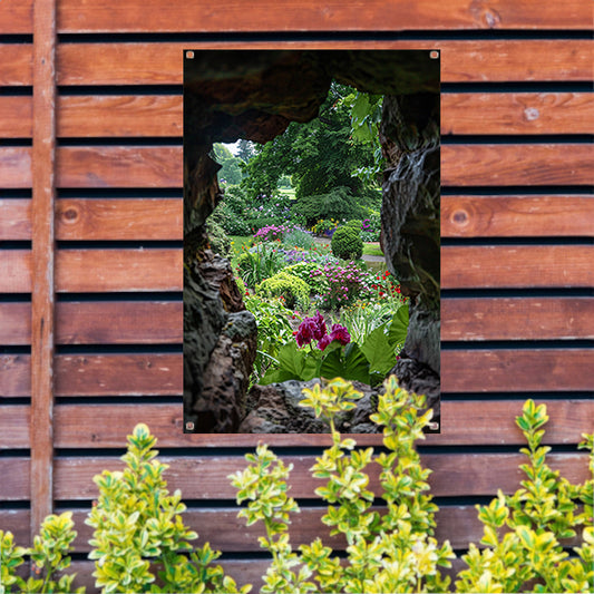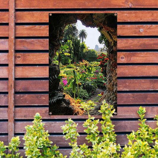 Stenen Raam met Uitzicht op Bloementuin tuinposter