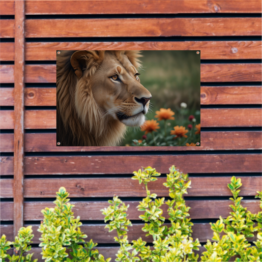 Bedachtzame Leeuw in een Veld van Bloemen tuinposter