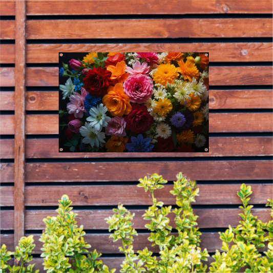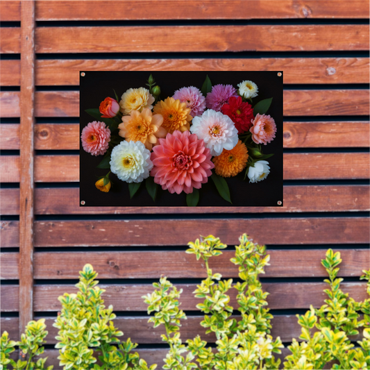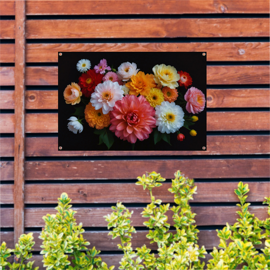 Levendige Bloemendiversiteit op Donkere Achtergrond tuinposter