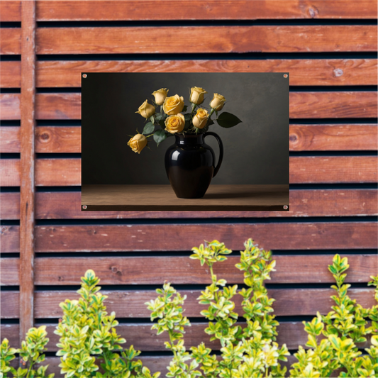 Zwart vaas met gele rozen stilleven tuinposter