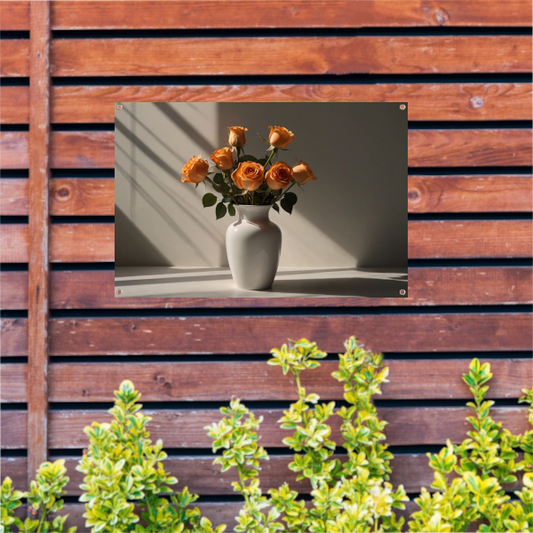 Elegante oranje rozen in witte vaas tuinposter