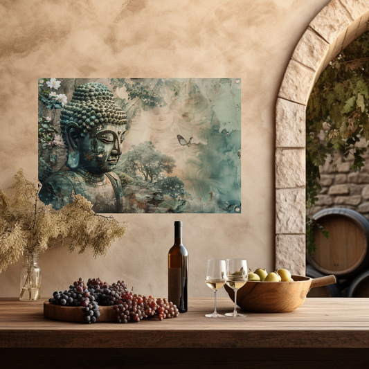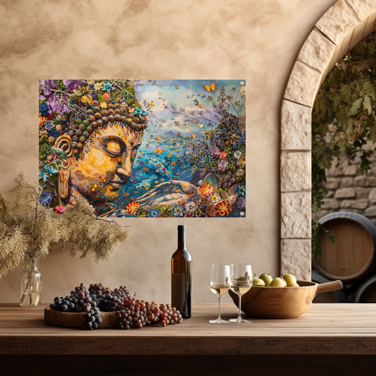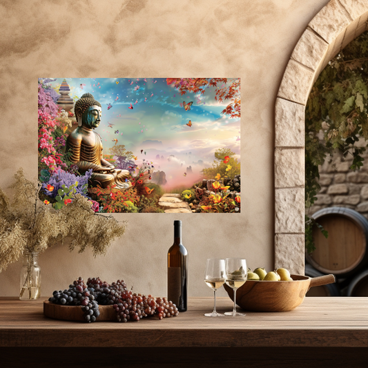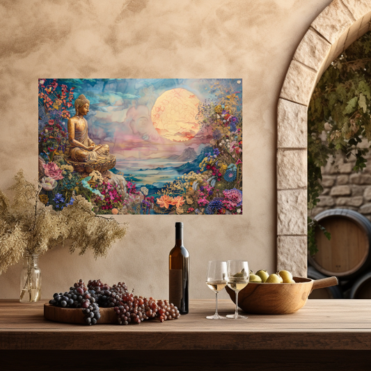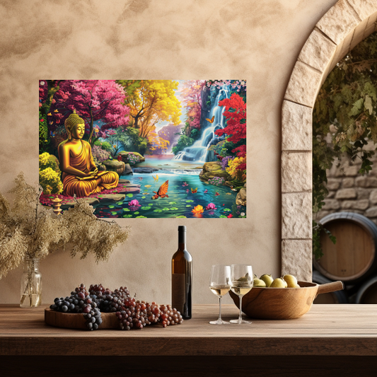 Sereniteit: Boeddha in kleurrijk natuurparadijs tuinposter