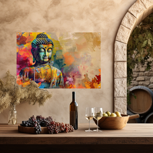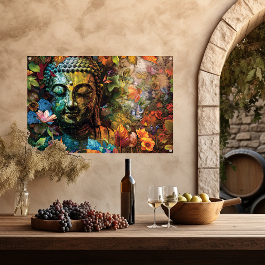 Eclectische Boeddha met Kleurrijke Achtergrond tuinposter