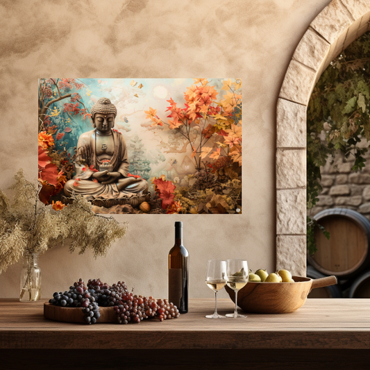 Boeddha omgeven door levendige herfsttinten tuinposter