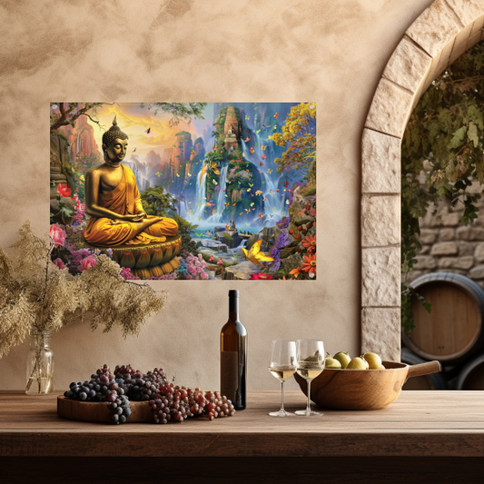 Serene Boeddha en Watervallen in Paradijselijke Natuur tuinposter