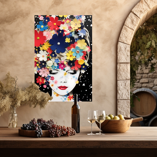 Vrouw omgeven door kleurrijke bloemen tuinposter
