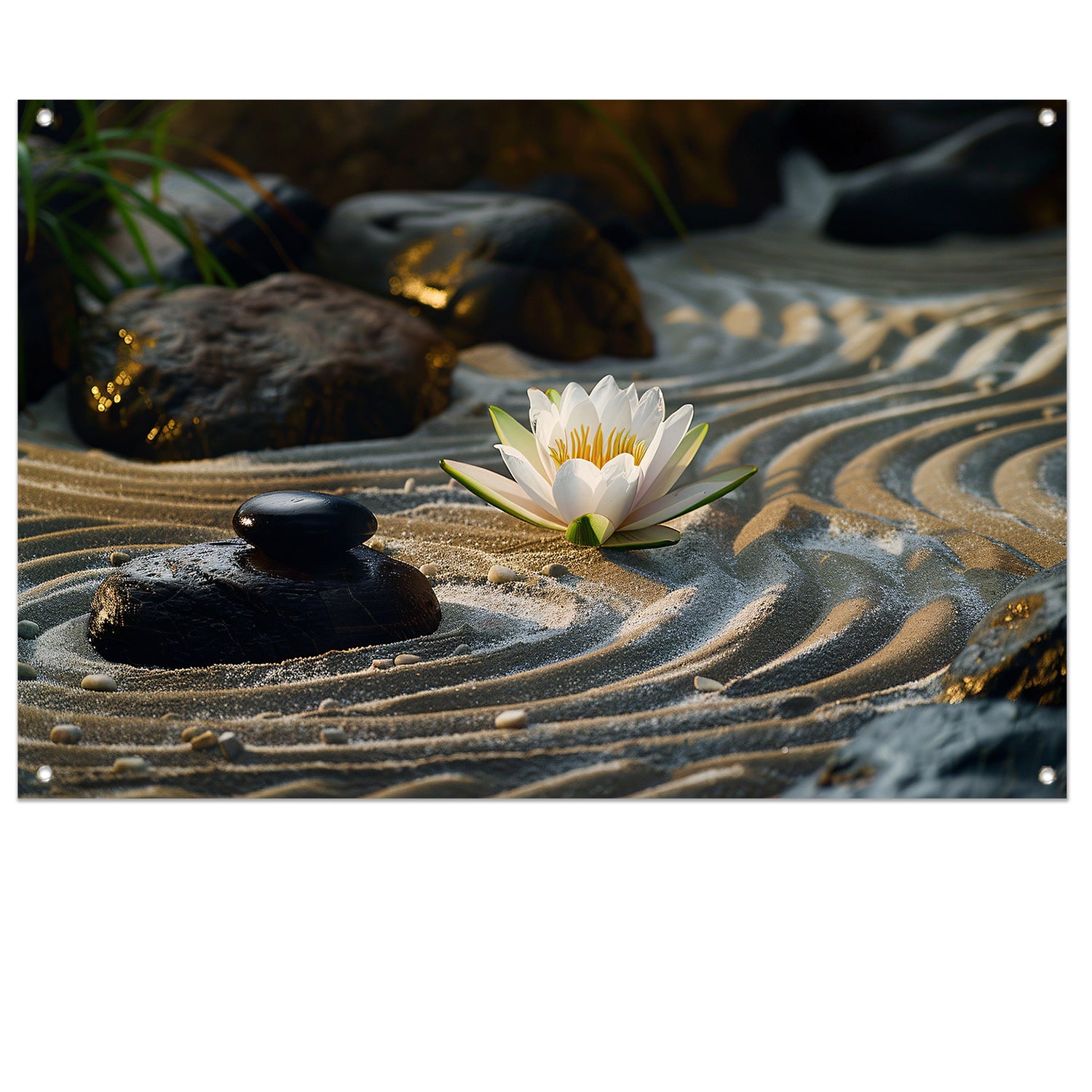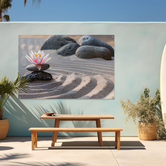 Zen-tuin met waterlelie en geharkt zand tuinposter