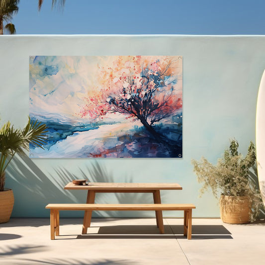Bloeiende boom in serene aquarel landschapsweergave tuinposter