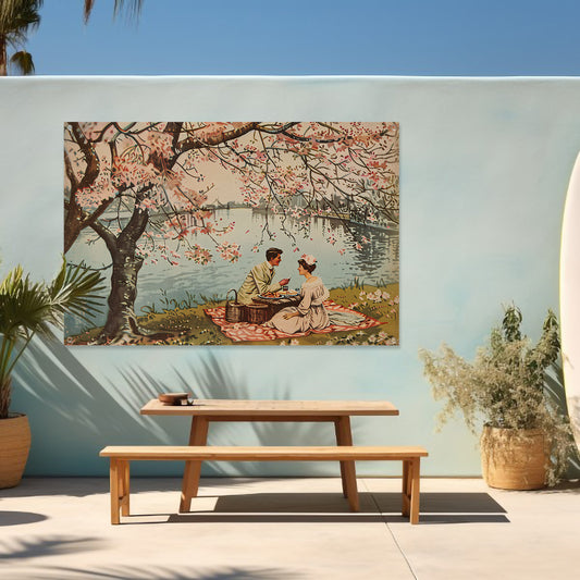 Romantische picknick onder bloeiende kersenbomen tuinposter