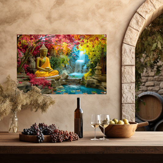 Meditatieve Boeddha in Herfstkleurige Oase tuinposter