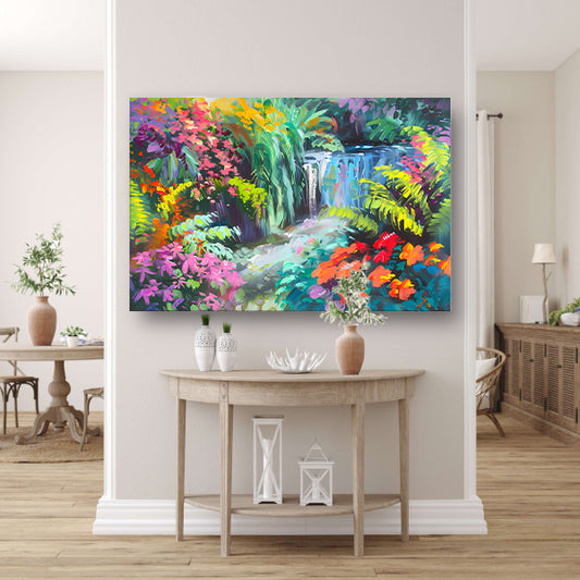 Impressionistische waterval met kleurrijke bloemenpracht poster