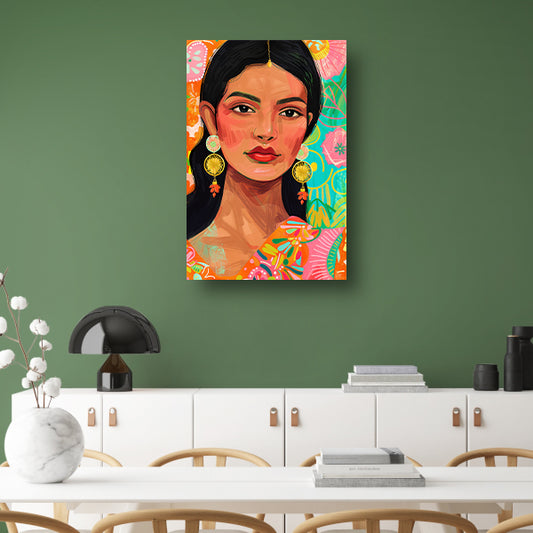 Kleurrijk portret Indiase vrouw met bloemenachtergrond poster