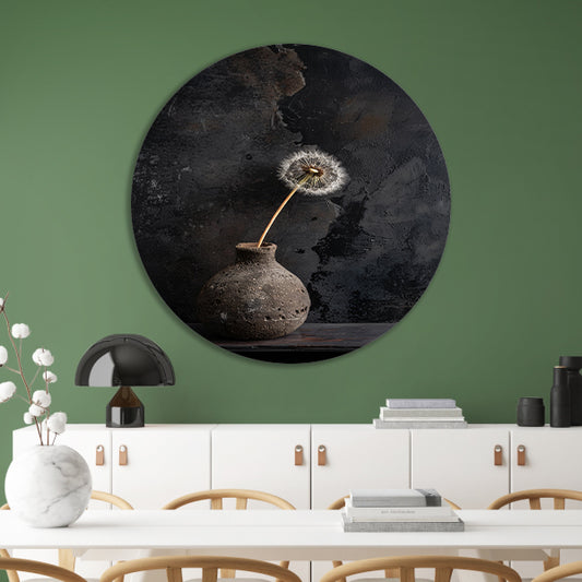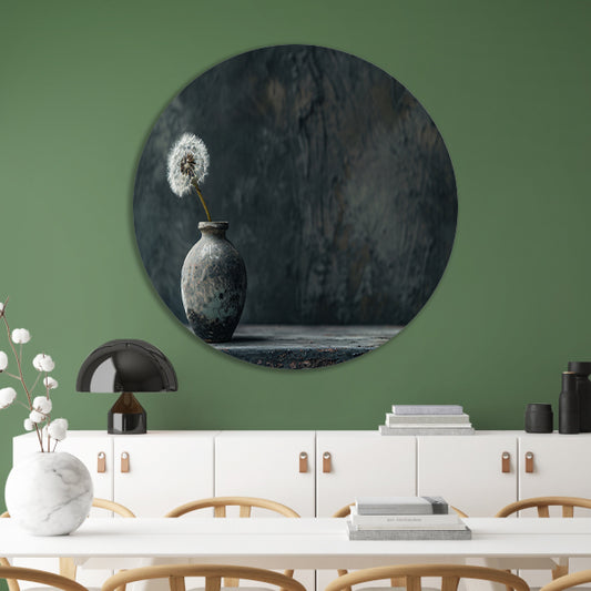 Eenzame paardenbloem in antieke vaas aluminium muurcirkel