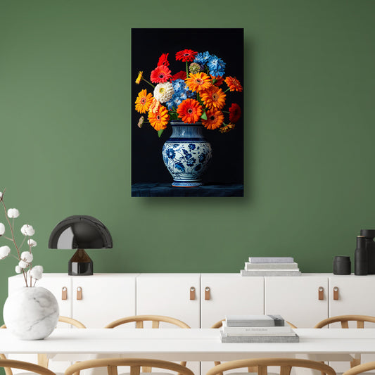 Levendige Bloemenpracht in Delfts Blauwe Vaas canvas met baklijst