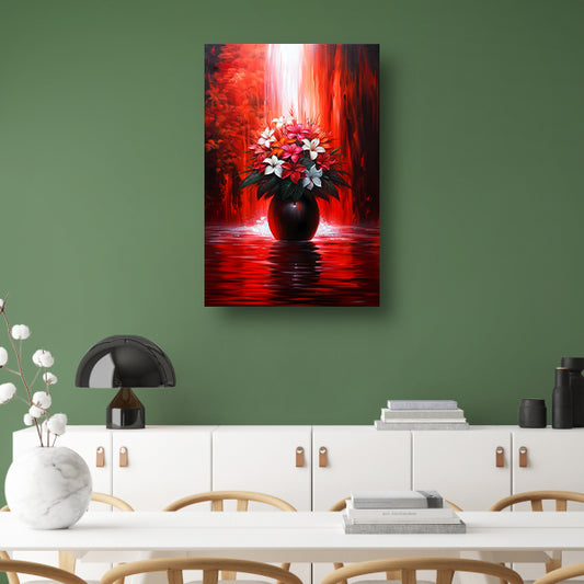 Levendige Bloemen in Elegante Zwarte Vaas op Rode Achtergrond canvas met baklijst