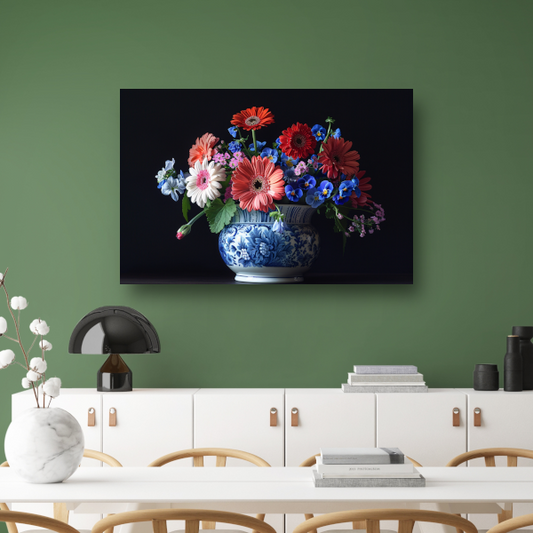 Elegant bloemenboeket in blauw-witte keramische vaas canvas met baklijst