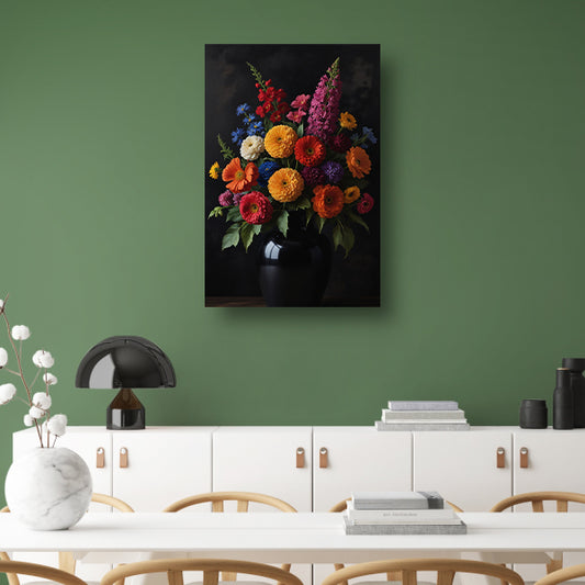 Kleurrijke Bloemenpracht in Donkere Vaas canvas met baklijst