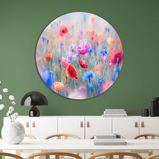 Een levendig veld van papavers en korenbloemen aluminium muurcirkel