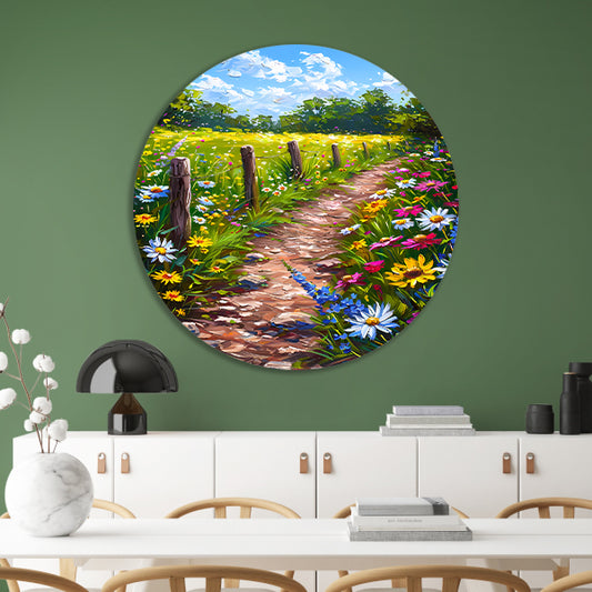 Schilderachtig bloemenpad in kleurrijk landschap aluminium muurcirkel