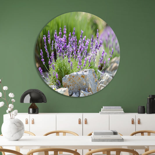 Lavendelbloemen in bloei naast grijsbruine rotsen aluminium muurcirkel