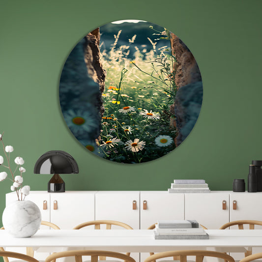 Bloemenveld door een magisch venster aluminium muurcirkel