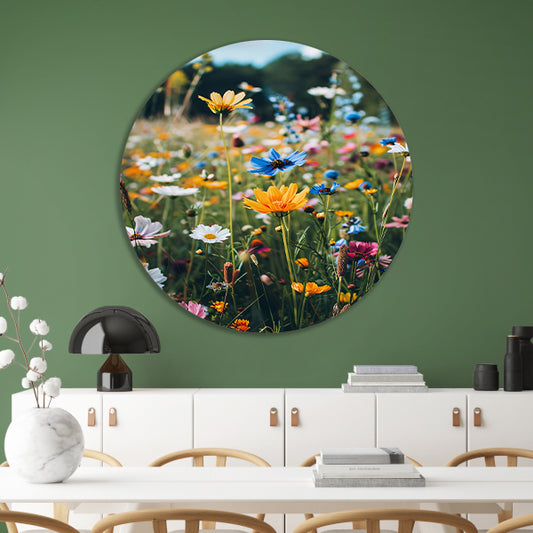 Kleurrijk Bloemenveld in Zomerzon aluminium muurcirkel