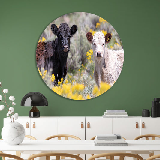 Twee Jonge Kalfjes in een Bloemenveld aluminium muurcirkel