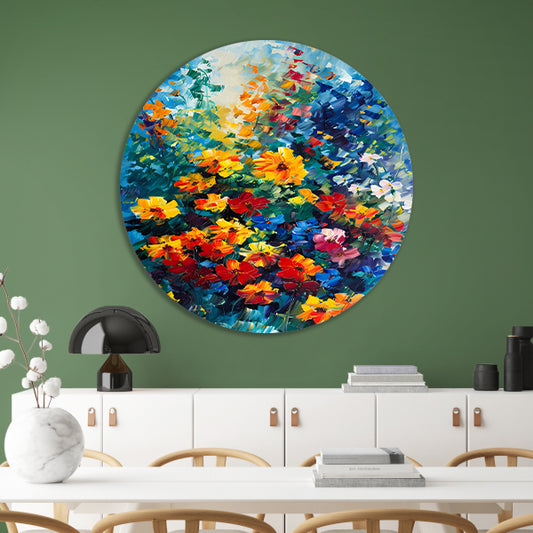 Kleurrijke abstracte bloemenveld schilderij aluminium muurcirkel