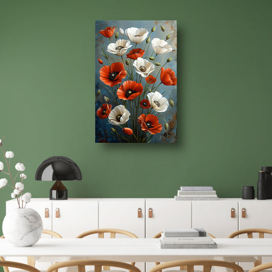 Rode en Witte Bloemen op Blauwe Achtergrond Schilderij acrylglas