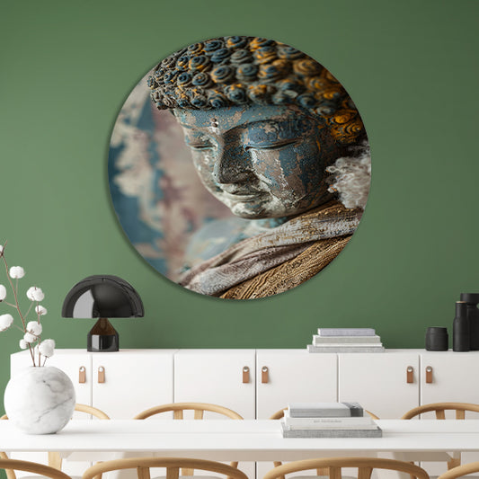 Verweerde Boeddha in serene meditatie aluminium muurcirkel