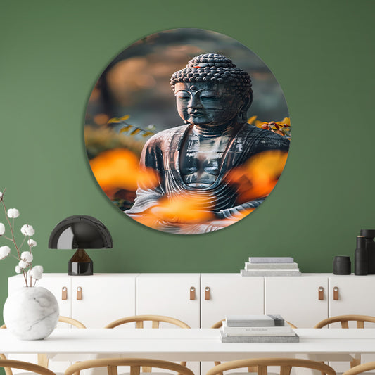 Meditatieve Boeddha in herfstachtige omgeving aluminium muurcirkel