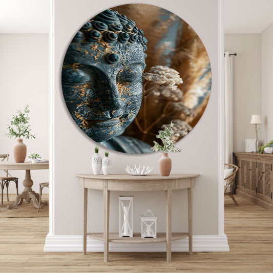 Boeddhabeeld met bloemen en rustieke kleuren aluminium muurcirkel