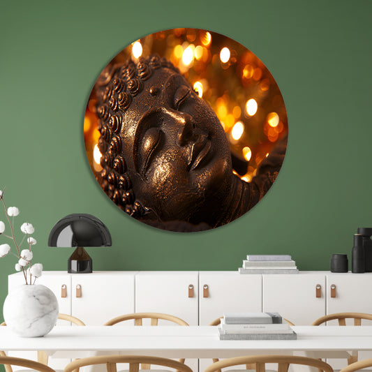 Close-up van Boeddha met warme verlichting aluminium muurcirkel