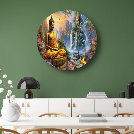 Serene Boeddha en Watervallen in Paradijselijke Natuur aluminium muurcirkel