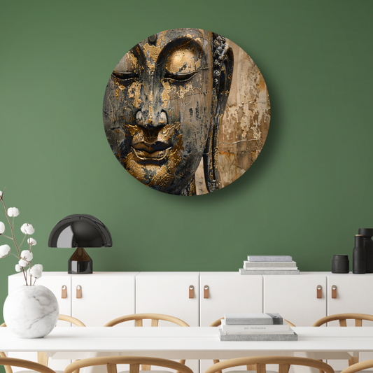 Gouden Boeddha portret op verweerde achtergrond aluminium muurcirkel