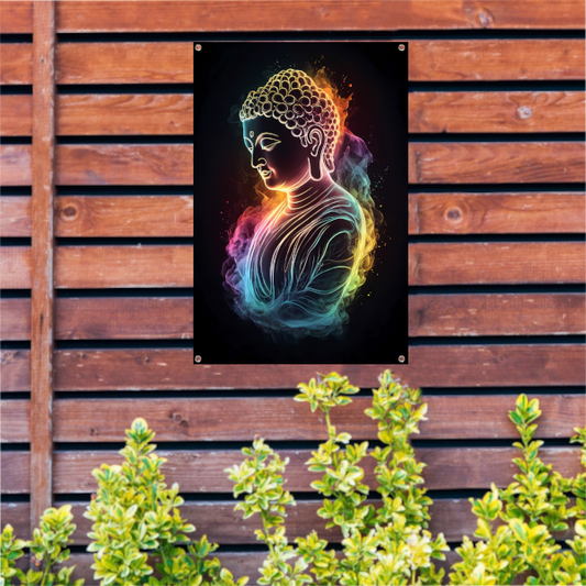 Serene Boeddha in Kleurrijk Spectraal Licht tuinposter