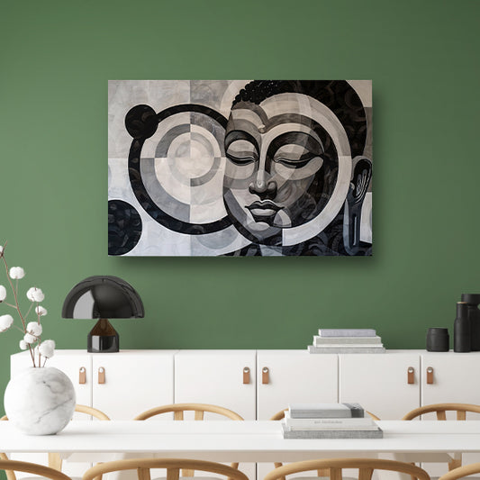 Surrealistisch boeddha schilderij in zwart-wit canvas met baklijst