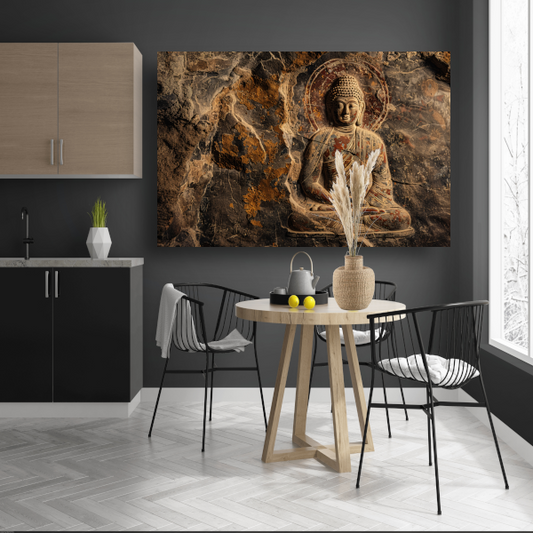 Meditatief Boeddha Sculptuur in Rotswand canvas met baklijst