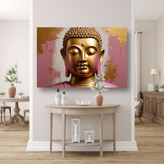 Moderne Gouden Boeddha met Roze Achtergrond canvas met baklijst