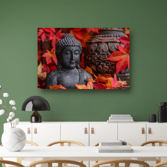 Boeddhabeeld met herfstbladeren canvas met baklijst