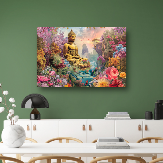 Meditatieve Boeddha in Kleurrijk Bloemenparadijs canvas