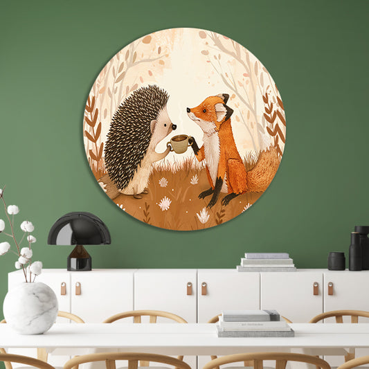 Egel en vos delen een moment in bos aluminium muurcirkel